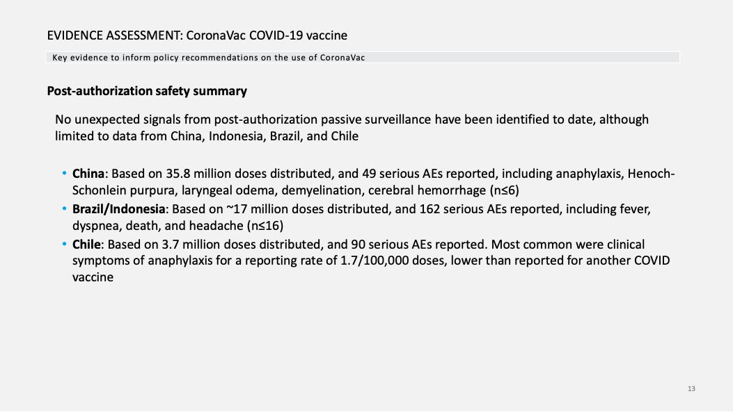巴西:随机试验,预防有症状的新冠肺炎效力51%,预防住院效力100%。看新闻:目前考虑数值较低的原因是间隔时间短(14天)、接种的是医务人员。(这一句不是who报告原内容)